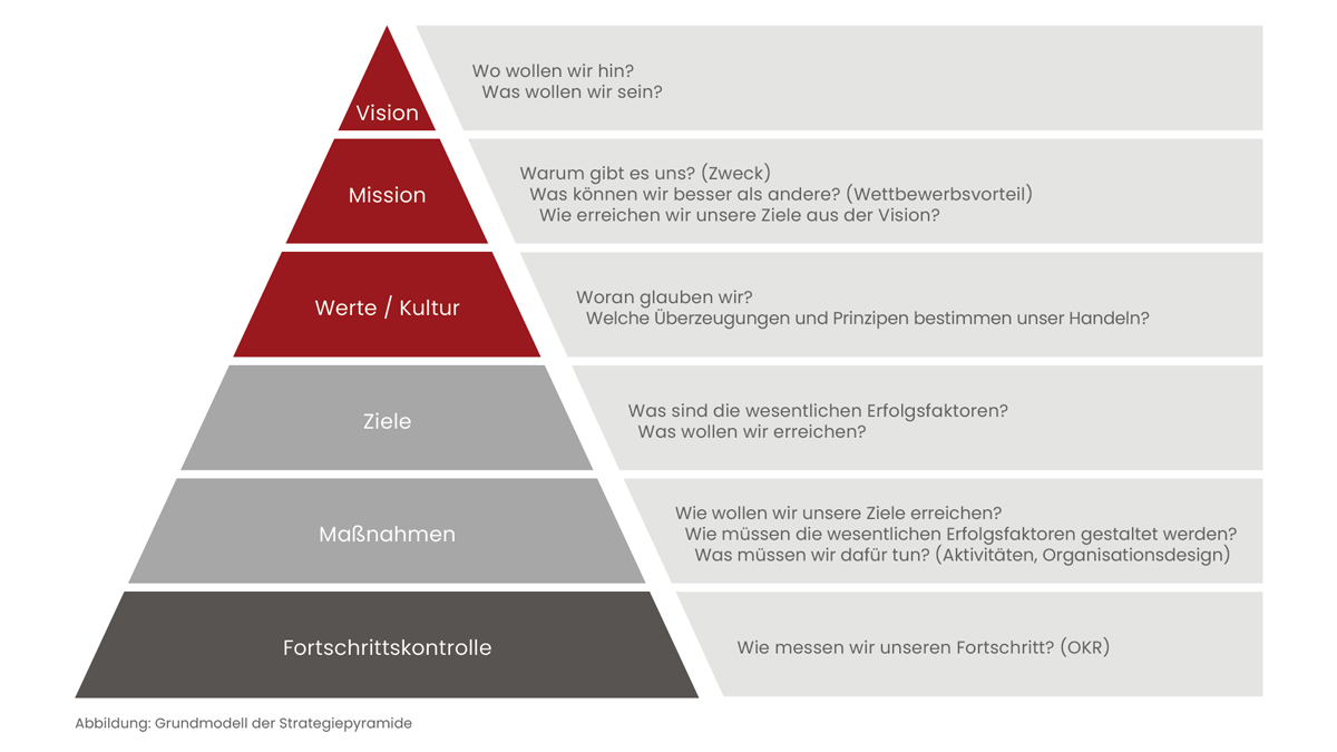 Nach dem erfolgreichen Durchlaufen des Strategieprozesses werden Sie für Ihr Unternehmen die Fragen der Strategiepyramide genausten beantworten können. Die Strategiepyramide ist Weg und Ziel zugleich: Während der Strategieerarbeitung gibt Sie uns Orientierung und danach bildet Sie ein Gefüge, was bei der Orientierung hilft und auch bei der Vermittlung der Strategie an Ihre Mitarbeitenden, wenn es um die Ziele, Wege, die Ressourcenzuordnung und die operativen Aufgabenstellungen mit klaren Verantwortlichkeiten geht.