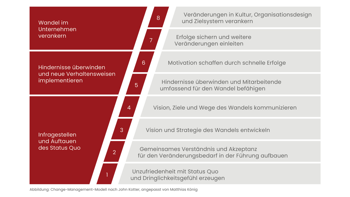 Für den Changeprozess gibt es verschiedene Methoden. In der Praxis bewährt hat sich der ganzheitliche Ansatz von John Paul Kotter. In Veränderungsprojekten wird dieser Prozess kontinuierlich durchlaufen und stellt sicher, dass die Ziele des Changemanagements und damit nachhaltige Verbesserungen in Ihrem Unternehmen erreicht werden.