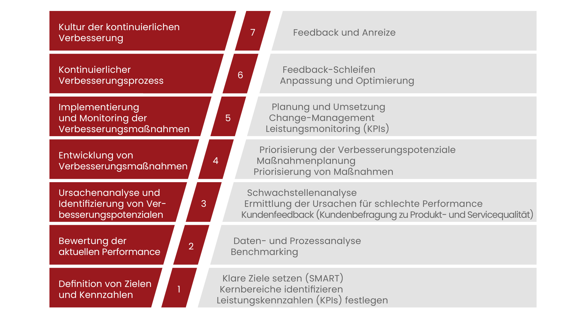 • Planung und Umsetzung: Umsetzungsplanung der detaillierten Aktionspläne für die ausgewählten Verbesserungsmaßnahmen und deren schrittweise Implementierung.